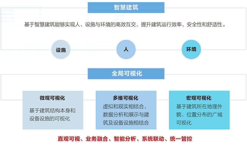 從建築樓宇/園區建築及設備設施智能化感知體係的建設集成、智慧建築全生命周期數據的有線無線及移動網絡傳輸的支持、到智慧建築方案平台大規模計算和存儲資源、一體化雲平台和高集成度網絡體係的綜合建設、以及基於可視化、大數據、BOB登陆